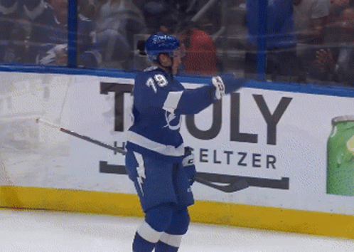Ross Colton, wearing jersey number 19 for the Tampa Bay Lightning, celebrates a thrilling goal on the ice, acknowledging the cheering fans.