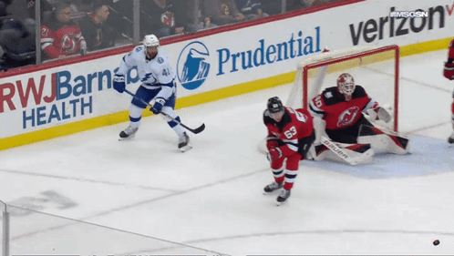 Steven Stamkos of the Tampa Bay Lightning scores a goal during a hockey game.