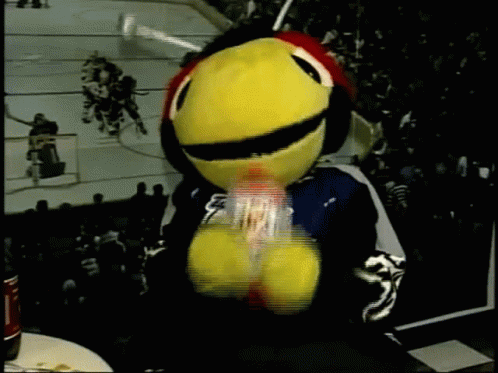 Tampa Bay Lightning mascot Thunderbug eats a bag of Doritos chips at a hockey game.