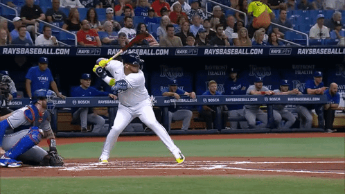 Isaac Paredes of the Tampa Bay Rays takes a powerful swing at the plate during a baseball game.