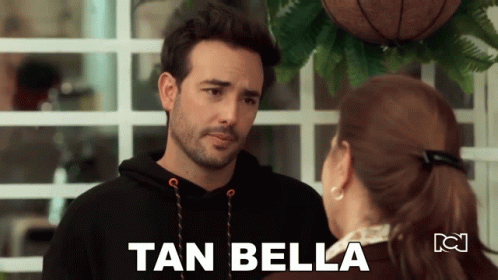 Mauricio, played by Sebastian Martinez, looks at a woman with the caption 'Tan Bella' (So Beautiful) on screen.