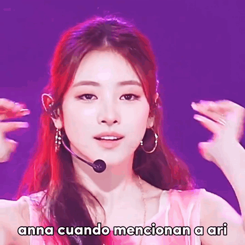 Tanaka Anna, a member of ME:I, smiles brightly and reacts happily when Ari is mentioned, as indicated by the Spanish caption.