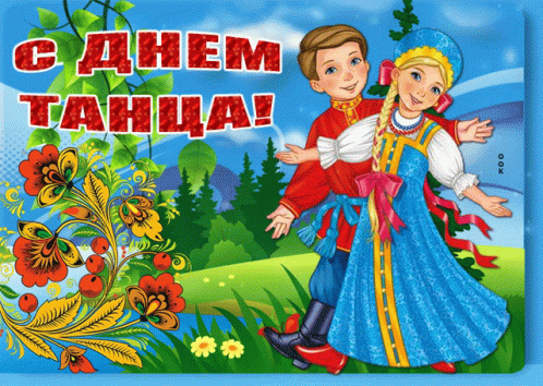 A cheerful boy and girl in traditional Russian folk costumes celebrating Happy Dance Day with vibrant floral art.