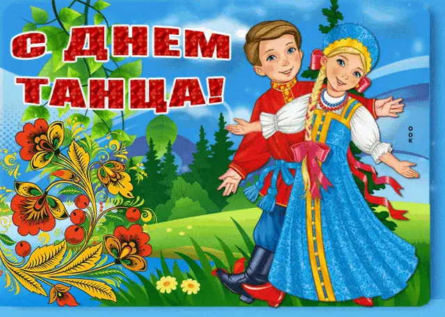 A couple ballroom dancing, celebrating World Dance Day with music notes and red roses in the background.