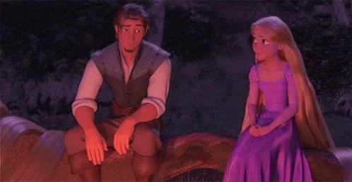 Rapunzel and Flynn Rider from Disney's Tangled share a tender moment, sitting on a log by a campfire.