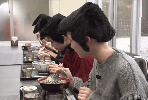 a group of people are sitting at a table with bowls of food