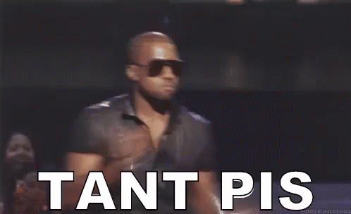Kanye West shrugging with the text 'TANT PIS' (Too Bad) displayed, a popular meme.