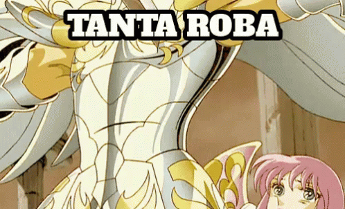 An impressive image of a knight in golden armor and a girl from Saint Seiya, with 'Tanta Roba' text.