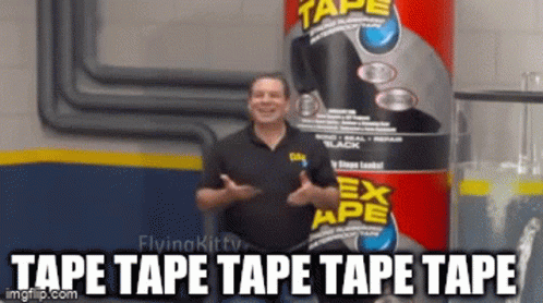Phil Swift promotes Flex Tape with the iconic 'TAPE TAPE TAPE' meme, showcasing its sealing power.