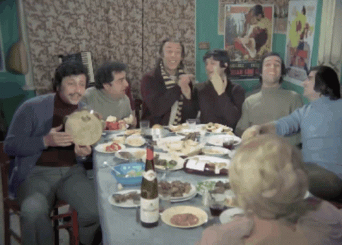 Tarik Akan, Kemal Sunal, Halit Akçatepe, Metin Akpınar, Münir Özkul, and Zeki Alasya enjoying a lively dinner.