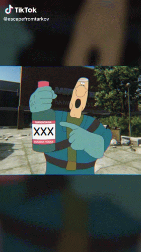 Sanitar from Escape from Tarkov proudly displays a bottle of 'Tarkovskaya XXX Russian Vodka' and a golden skull.