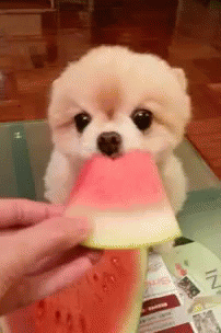 Adorable Pomeranian puppy enjoys a refreshing slice of watermelon, held by a human hand.