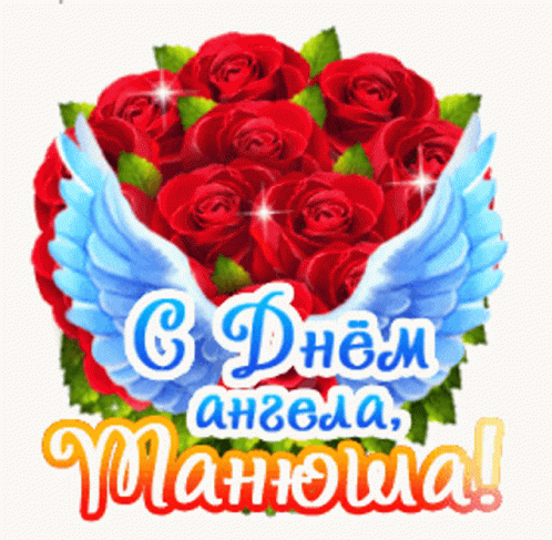 A vibrant bouquet of red roses with blue angel wings, featuring changing Russian text 'Happy Angel Day, Manyusha!' and 'Happy Angel Day, Tanya!'.