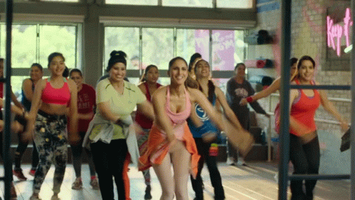 Maanvi Brar leads a group of women in an energetic Bollywood dance workout, shaking their bodies to the music.