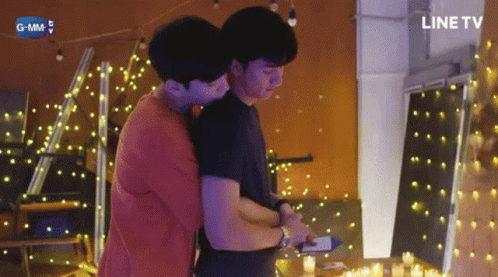 Tay New share a tender hug and kiss in a romantic candlelit setting from the Thai BL series Dark Blue Kiss.