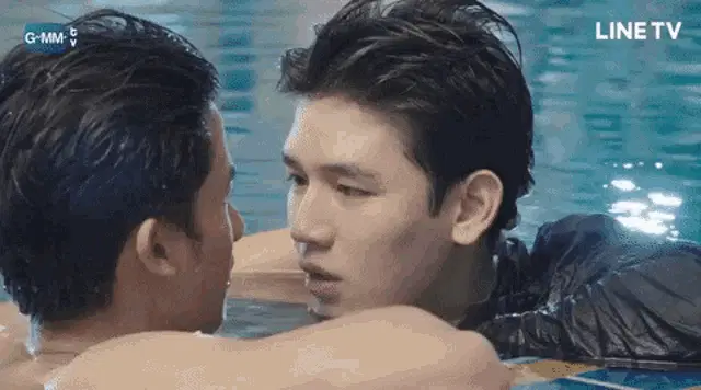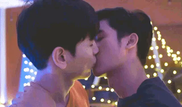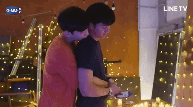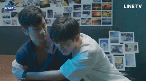 Tay New (เตนิว) share an emotional hug, featuring Tay Tawan and Newwiee, from the series Dark Blue Kiss.