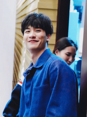 Tay Tawan smiles brightly, wearing a blue jacket, with 'Taynew' visible in the background.
