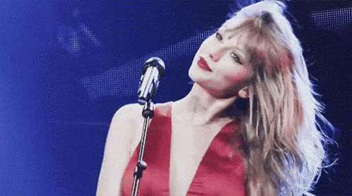 Taylor Swift performs on stage in a red dress, delivering an iconic hairflip while singing into a microphone.