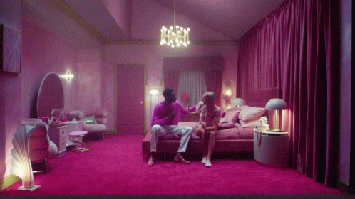 Taylor Swift and a man sit on a bed in a vibrant pink room from the "Lover" music video.