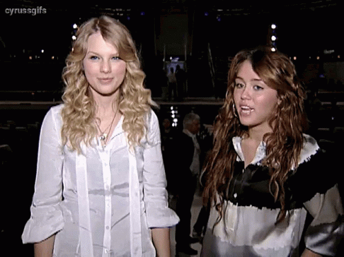 Taylor Swift and Miley Cyrus share a warm hug, smiling for the camera at an event.