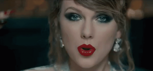 Taylor Swift with striking red lips and dark eye makeup, delivering the line 'Of course.'
