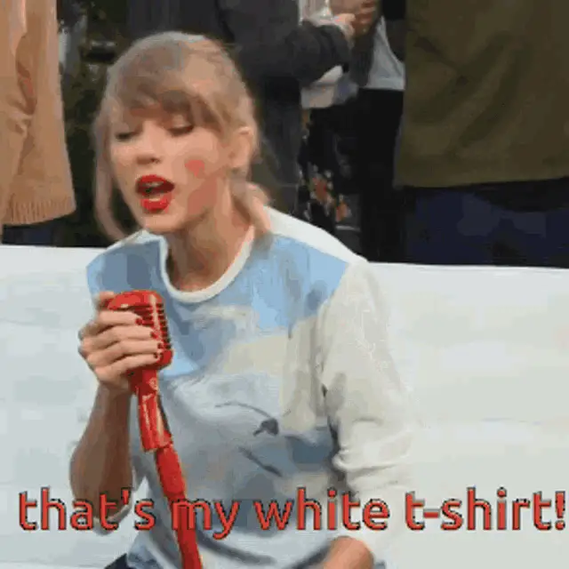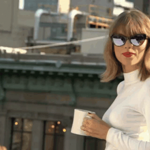 Taylor Swift on a rooftop, wearing sunglasses and a white turtleneck, holding a coffee mug.