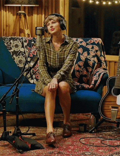 Taylor Swift in a recording studio, wearing headphones and a plaid shirt, sitting on a blue couch.