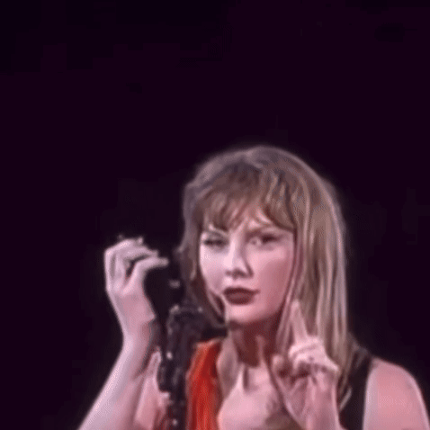 Taylor Swift performing during the Eras Tour, making a 'shh' gesture while singing into a microphone.