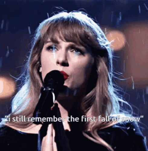 Taylor Swift performs a song in a winter setting with falling snow, singing into a microphone.