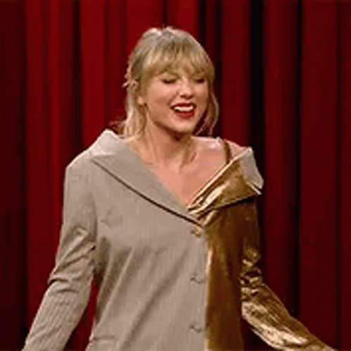 Taylor Swift reacts on The Tonight Show Starring Jimmy Fallon, wearing a unique gold and grey jacket.