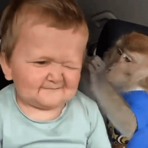 Hasbulla makes a funny, wincing face while a monkey playfully interacts with him in this viral clip.