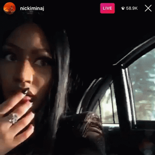 Nicki Minaj makes a playful eye-roll expression during a live stream from inside a car.
