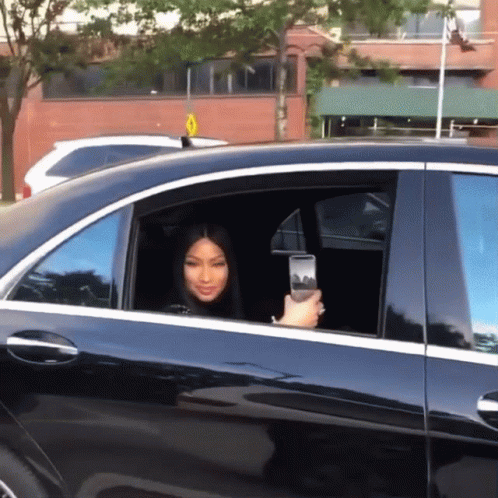 Nicki Minaj waves from the back seat of a black car while holding her phone, captured by Tayomaki.