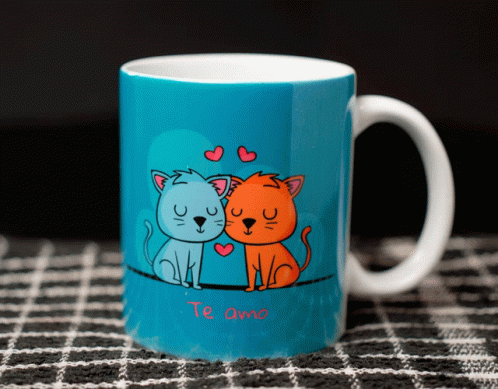 A blue mug featuring cute cartoon cats, hearts, and Spanish phrases 'Te amo' and 'Vos & Yo', expressing love.