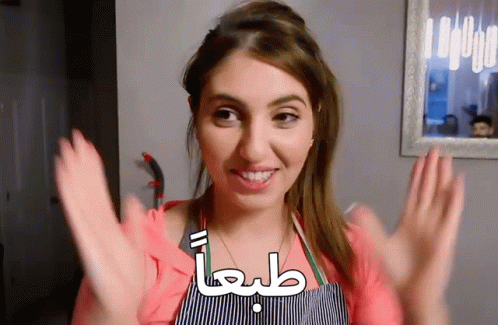 Asala Maleh smiling, wearing a pink shirt and apron, with the Arabic phrase 'Of course' displayed.