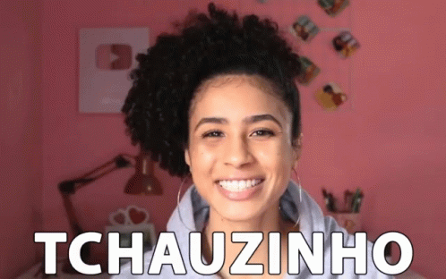 Ludmila Reis smiles brightly in front of a pink wall with 'Tchauzinho' written on it, waving goodbye.