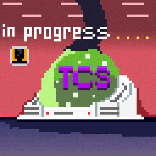 Pixel art animation featuring a green blob with 'TCS' and 'in progress' text, related to The Cryptic Society.