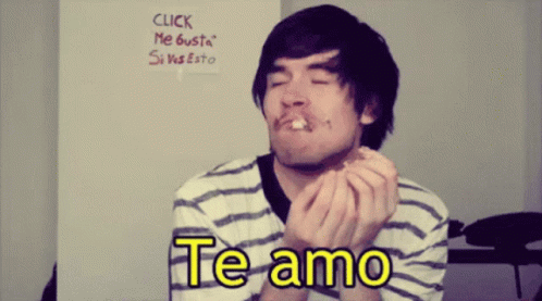 A man in a striped shirt makes a goofy face while saying 'Te amo' (I love you) in a meme video.