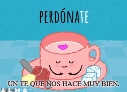 Animated cup of tea with self-care messages: Forgive, Educate, Overcome, Pamper, Value, Love yourself.