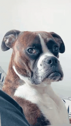 A brown and white Boxer dog looks directly at the camera with an intense, watchful expression.