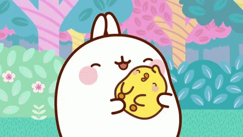 Molang affectionately hugs Piu Piu in a colorful forest, expressing 'Te Quiero Abrazo'.