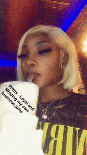A woman with blonde hair sips from a large cup, embodying the 'Pretty, Loyal, and Minding my own business juice' vibe.