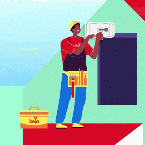 An animated technician from Ikeja fixes a wall-mounted wifi device with tools from his toolbox.