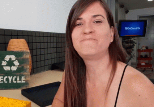 Tecnonauta Anna smiles and laughs, sitting in front of a recycle sign.