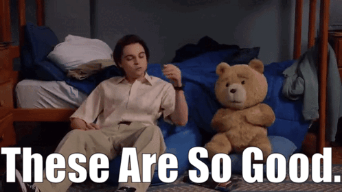 A young man from the Ted TV show reacts to something "so good" while sitting next to a teddy bear.