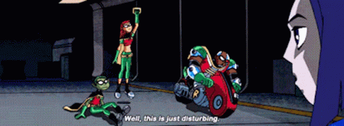 Raven observes a disturbing scene with Beast Boy (as Robin) on the ground and a strange vehicle nearby.
