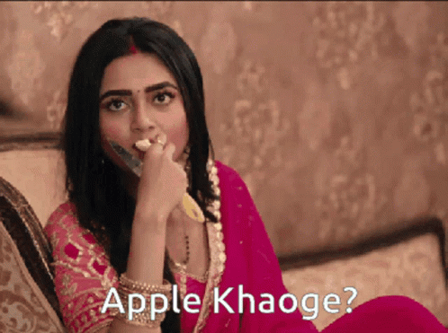 Tejasswi Prakash, known for Naagin 6, holds an apple and asks 'Apple Khaoge?' in a popular moment.