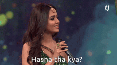 Tejasswi Prakash holding a microphone and asking 'Hasna tha kya?' in a memorable moment that became a popular meme.