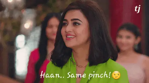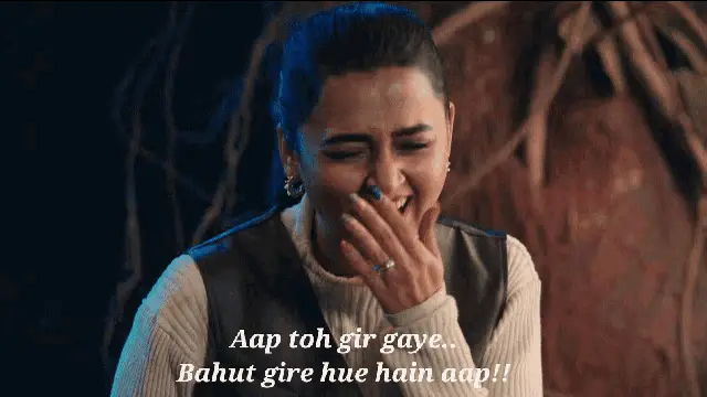 Tejasswi Prakash shrugging with a 'Pata Nahi' expression, sitting outdoors in a blue dress.