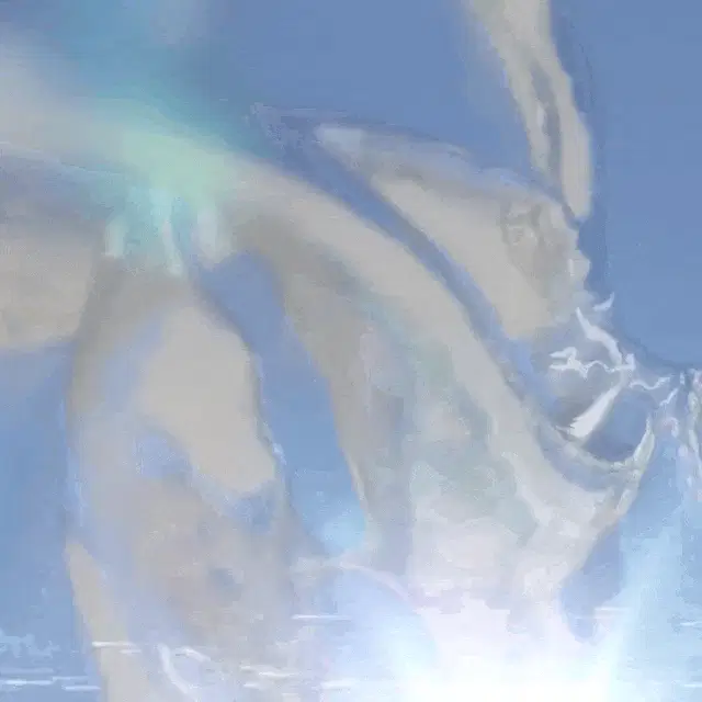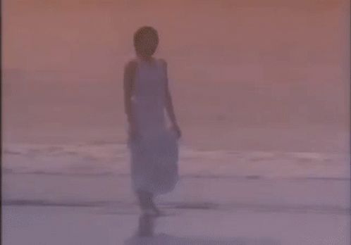 A woman in a white dress walking on a misty beach, evoking a vaporwave aesthetic.